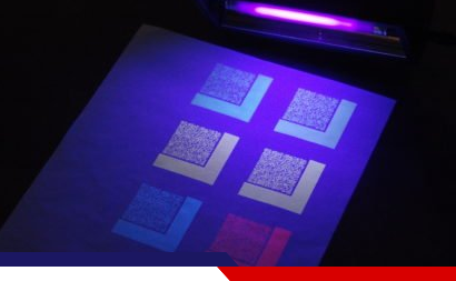 This print is totally invisible when viewed through naked eyes, but the text/logo becomes visible when viewed through UV torch.